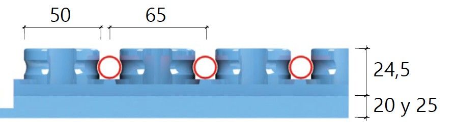 Precio €/m2. Panel aislante plastificado espesor total 44,5mm (20+24,5). Panel aislante termoconformado Maxlor de Poliestireno Expandido EPS plastificado de buena resistencia a las pisadas durante la instalación y a los esfuerzos de la tubería con aplicación en sistemas de climatización radiante con tubo Maxlor. Machihembrado a 4 cantos por encastre, permitiendo un fácil y perfecto ajuste de las placas evitando fallos de alineación de los tetones además de conseguir un sistema totalmente continuo, sin posibilidad de puentes térmicos. Las placas cuentan con tetones de 24,5 mm. de altura con un diseño que permite que las tuberías queden sujetas de una forma muy rápida y sin necesidad de grapas o complementos. Paso de tuberías a 65 mm. Permite utilizar tubería Ø16 hasta Ø20. Un solo operario basta para fijar las tuberías. 12 placas de 1.400x670mm por caja
